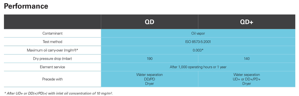 QD(+) filters efficiently reduce hydrocarbons, odors and oil vapor in your compressed air stream to protect your investment, equipment and processes. The activated carbon layers will, by the use of adsorption, reduce the residual oil content to less than 0.003 mg/m³. The pressure drop is low and stays minimal during the lifetime of the filter.